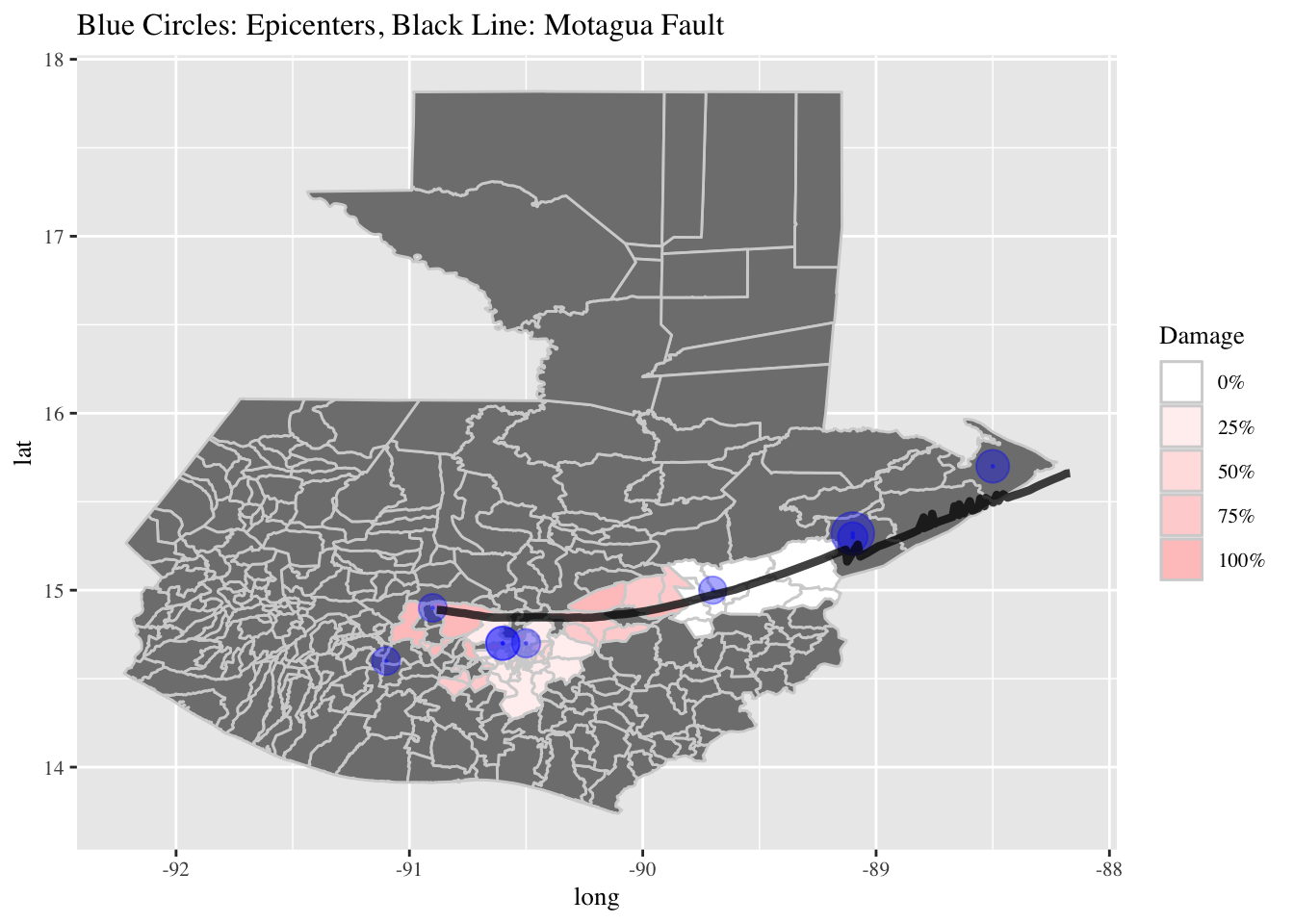 q <- q + ggtitle("Blue Circles: Epicenters, Black Line: Motagua Fault")